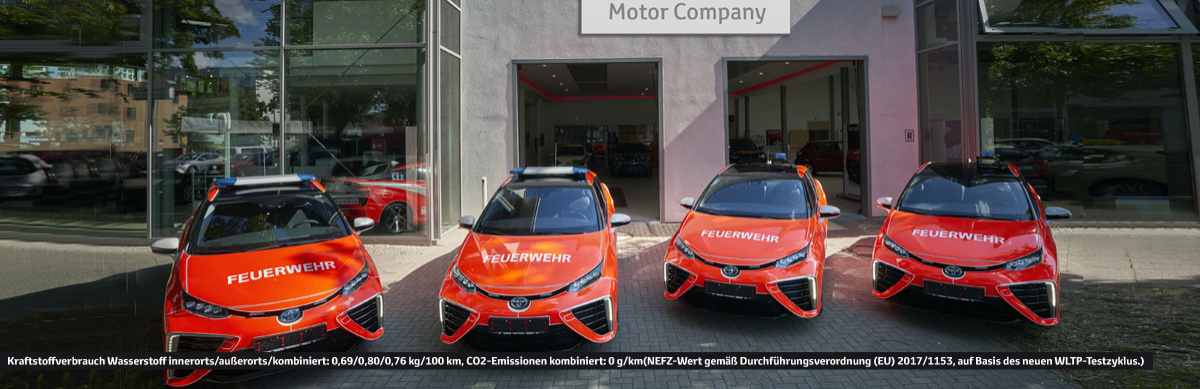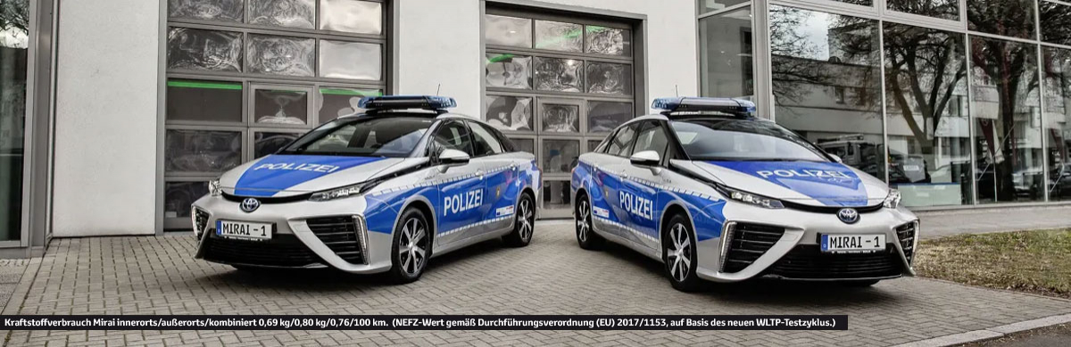 Polizei, Feuerwehr, Ordnungsämter und die BSR sind zunehmend mehr hybrid unterwegs: Mit unseren Hybridmodellen von Toyota. Besonders innovativ fahren Polizei und Feuerwehr: Mit Wasserstoff!. Die Toyota Mirai Brennstoffzellenlimousinen sind mit ihrer charakteristischen Beklebung sofort als Flottenfahrzeug der Polizei bzw. Berliner Feuerwehr zu erkennen. Ein 113 kW (154 PS) starker Elektromotor sorgt dafür, dass die Einsatzfahrzeuige nicht nur schnell, sondern auch lokal emissionsfrei zu ihrem Einsatzort in der Hauptstadt kommen. Die beiden Wasserstofftanks der Limousine ermöglichen Reichweiten von über 500 Kilometern pro Tankfüllung. Und aus dem Auspuff des Mirai kommt lediglich Wasserdampf.